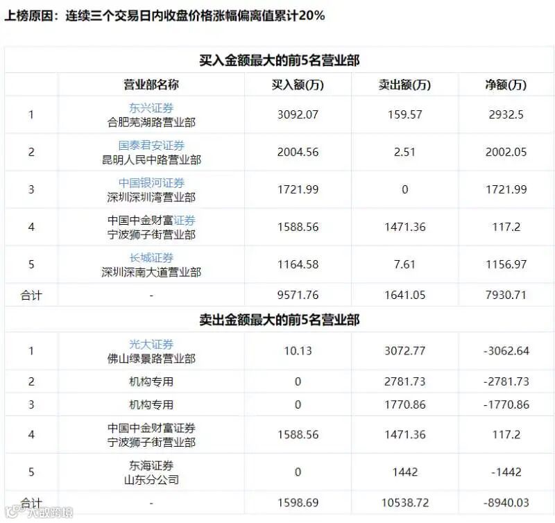 今日,全聚德因连续三个交易日涨幅偏离值累计20%而登上龙虎榜,其中两机构席位合计卖出超4500万元,占今日成交额的近四分之一。此外,东兴证券合肥芜湖路证券营业部、国泰君安证券昆明人民中路证券营业部分别买入3092.07万元、2004.56万元;光大证券佛山绿景路证券营业部、中国中金财富证券有限公司宁波狮子街证券营业部分别卖出3072.77万元、1471.36万元。