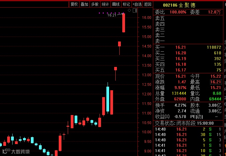作为“烤鸭一哥”的全聚德可谓近期二级市场的焦点之一。今日开盘高开后不久便封住涨停至收盘,这已经是全聚德连续四个交易日实现涨停,并实现了6天5板,最新报收16.21元,成交2.08亿元,涨停板封单金额也近2亿元。