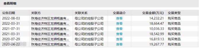 龙狮瓶盖公司的公开资料不多,据Wind统计,贵州茅台每年与龙狮瓶盖公司有两次关联交易,贵州茅台在年初和年中会进行两次瓶盖采购,采购金额均不低于1亿元。3月31日,贵州茅台公告,公司与龙狮瓶盖公司的关联交易金额为1.87亿元。8月3日,贵州茅台公告,公司与龙狮瓶盖公司的关联交易金额为1.42亿元。