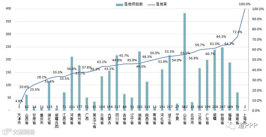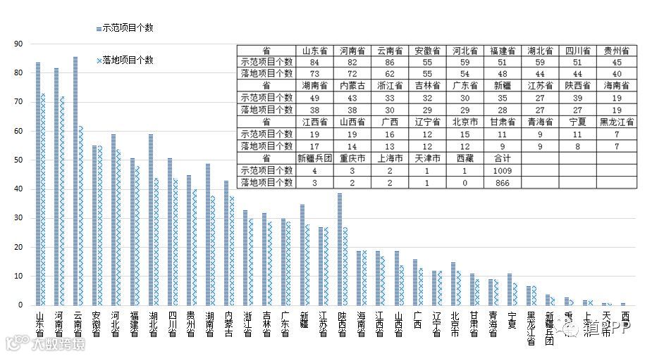 按各地落地示范项目数统计,山东(含青岛)已有73个示范项目签约进入执行阶段,居全国第一;其后河南72个、云南62个、安徽55个、河北54个。其余各省均不足50个。各地示范项目数与落地数对比如图2-4。