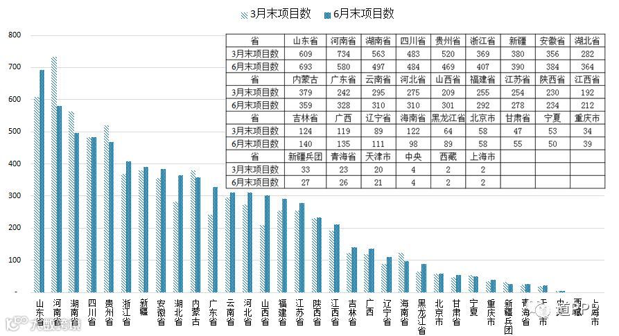 管理库项目执行情况:二季度(4-6月),管理库环比一季度新增项目329个、投资额4,350亿元。1-6月,管理库新增项目612个、投资额1.2万亿元。截至2018年6月,管理库累计项目数7,749个、投资额11.9万亿元。落地项目,二季度管理库环比新增落地项目344个、投资额4,884亿元,落地率环比增加2.5个百分点。1-6月,新增落地项目939个、投资额1.4万亿元,落地率上升9.1个百分点。截至2018年6月,管理库累计落地项目数3,668个、投资额6.0万亿元,落地率47.3%。二季度环比新增已开工项目309个;管理库累计已开工项目总数1,684个、投资额2.5万亿元,开工率45.9%。地区方面,二季度环比新增项目数前三位是山西、广东、山东(含青岛),分别为92个、86个、84个;二季度环比新增投资额前三位是浙江、湖北、广东,分别为1,193亿元、1,035亿元和810亿元。管理库累计项目总数前三位是山东(含青岛)、河南、湖南,分别为693个、580个、497个;累计投资额前三位是贵州、湖南、浙江,分别为10,040亿元、8,058亿元、7,704亿元。行业方面,二季度环比新增项目数前三位是市政工程、交通运输、生态建设和环境保护,分别为212个、67个、33个;二季度项目环比新增投资额前三位是市政工程、交通运输、生态建设和环境保护,分别为2,020亿元、886亿元、754亿元。管理库累计项目总数前三位是市政工程、交通运输、生态建设和环境保护,合计占管理库项目总数的62.1%;累计投资额前三位是市政工程、交通运输、城镇综合开发,合计占落地项目总投资额的74.1%。基本公共服务领域项目(文化、体育、医疗、养老、教育、旅游等6个领域)二季度项目数环比新增2个,投资额减少146亿元。管理库累计基本公共服务领域项目总数1,351个、投资额1.2万亿元。回报机制,二季度使用者付费类项目净减项目184个、投资额1,651亿元;可行性缺口补助类项目新增项目475个、投资额6,501亿元;政府付费类项目新增项目38个,投资额减少500亿元。管理库累计使用者付费类项目715个、投资额1.1万亿元;累计可行性缺口补助类项目3,898个、投资额7.5万亿元;累计政府付费类项目3,136个、投资额3.4万亿元。污染防治与绿色低碳项目二季度环比新增项目191个、投资额1,962亿元。管理库累计污染防治与绿色低碳项目总数4,193个、投资额4.3万亿元。