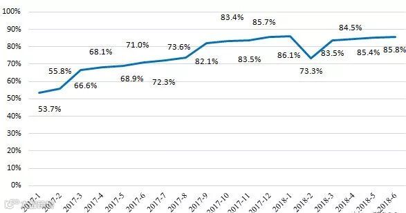 项目落地率,指执行和移交两个阶段项目数之和与管理库项目数的比值。通过开展示范项目整改工作,二季度落地示范项目新增项目23个、投资额75亿元。截至2018年6月,落地示范项目累计866个、投资额2.0万亿元,落地率85.8%,无移交阶段项目。示范项目总体落地率变化如图2-2-1。