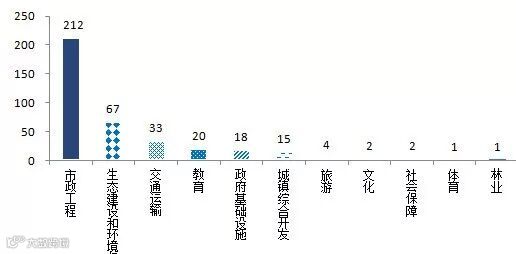 二季度管理库新增项目数前三位是市政工程、生态建设和环境保护、交通运输,分别为212个、67个、33个,如图1-4-1。