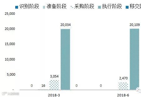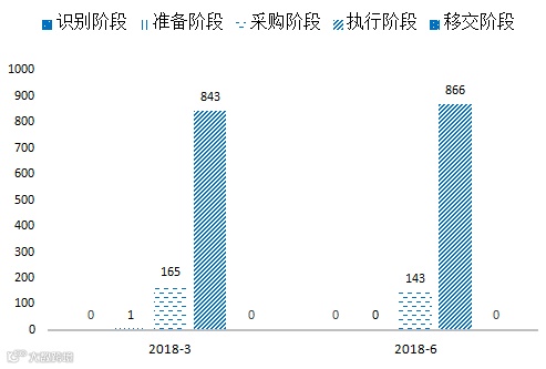PPP项目按全生命周期分为识别、准备、采购、执行和移交5个阶段,其中,准备、采购、执行和移交4个阶段的项目被纳入管理库。2018年一季度与二季度管理库各阶段示范项目数和投资额情况如图2-1-1和图2-1-2。