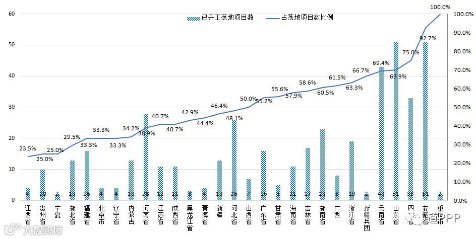 图2-6 二季度开工示范项目数各省分布及占落地示范项目数比例