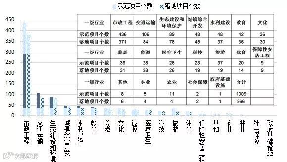 二季度,四批示范项目共1,009个,投资额2.3万亿元,覆盖31个省(自治区、直辖市)及新疆兵团和19个领域。其中,2014年第一批示范项目21个(最初为30个,陆续调出9个),总投资额687亿元;2015年第二批示范项目160个(最初为206个,陆续调出46个),总投资额4,672亿元;2016年第三批示范项目432个(最初为516个,陆续调出84个),总投资额9,654亿元;第四批示范项目396个(2018年2月颁布),总投资额7,565亿元。落地示范项目共866个,投资额2.0万亿元。