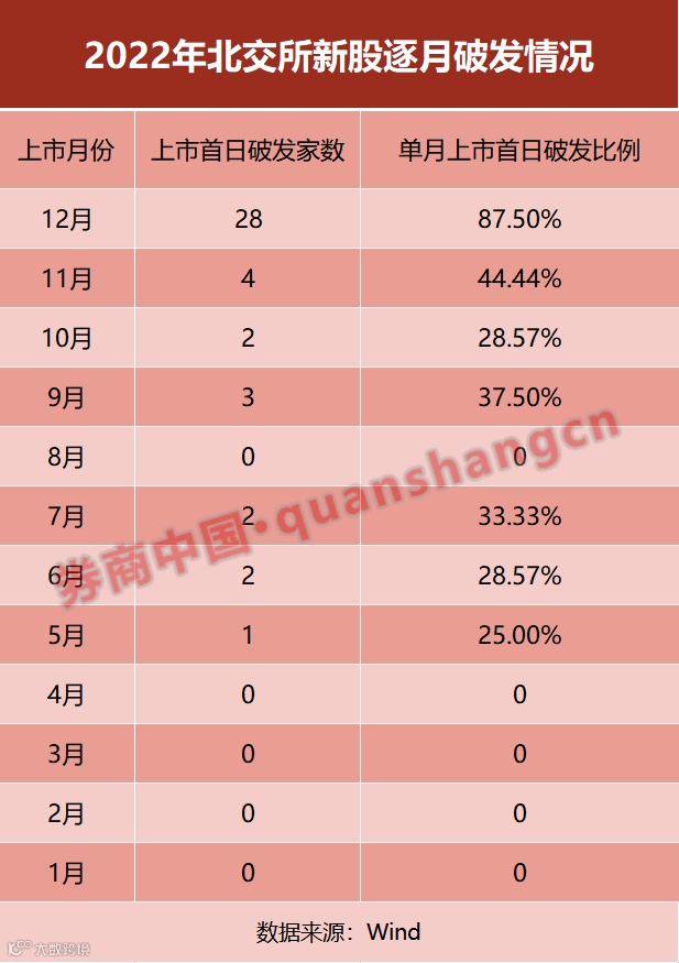 2022年12月的北交所新股上述表现有点冷。Wind数据显示,12月北交所上市首日破发新股共有28只,占比达到87.5%,成为北交所历史单月之最。
