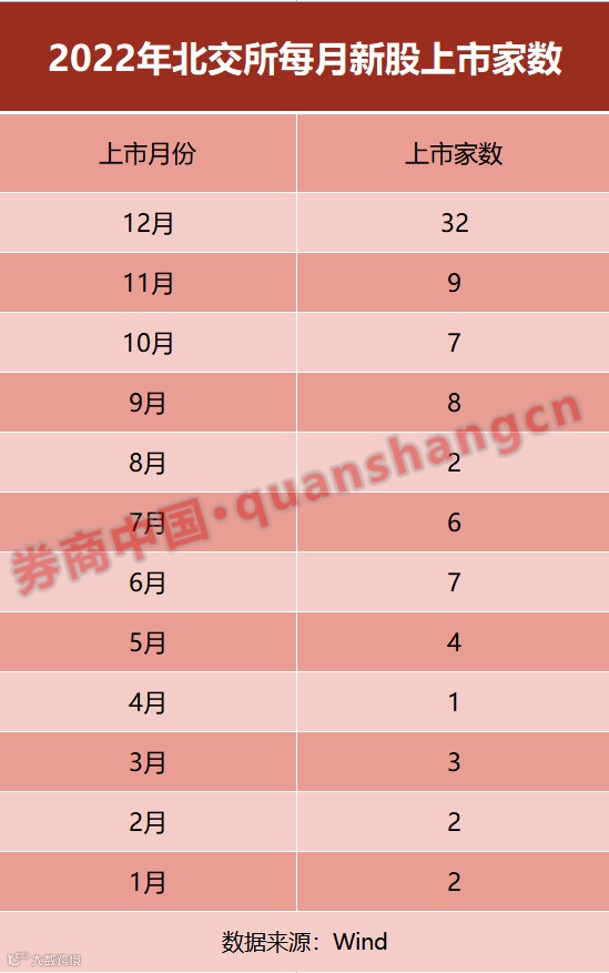 根据券商中国记者整理,2022年全年北交所共迎来83家企业上市,其中12月新上市的企业就多达32家,占比达到39%。1-11月北交所每月新上市的家数只有个位数,其中下半年7-11月依次有6家、2家、8家、7家、9家。