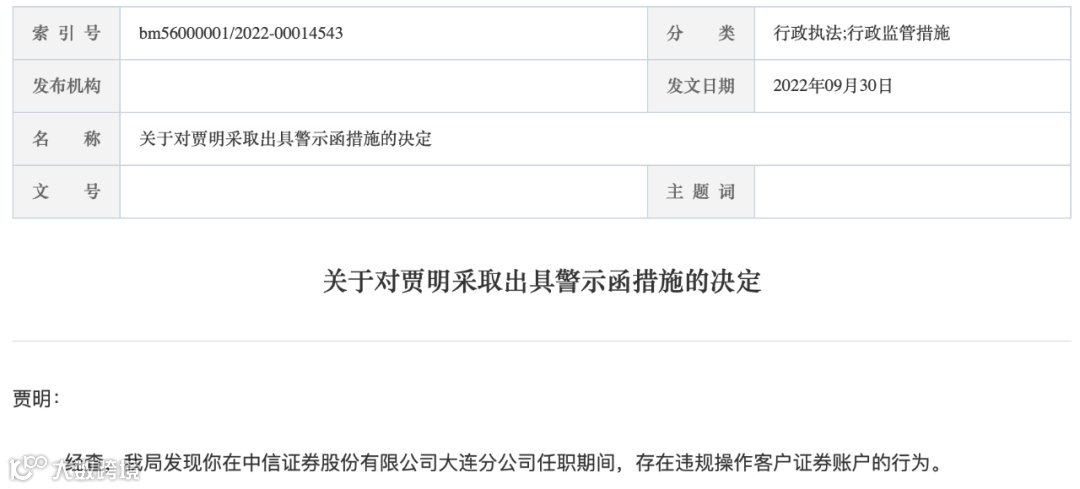 例如,今年9月30日,大连证监局公布罚单,证券从业者贾明在中信证券股份有限公司大连分公司任职期间,因存在违规操作客户证券账户的行为,被采取出具警示函的行政监管措施。