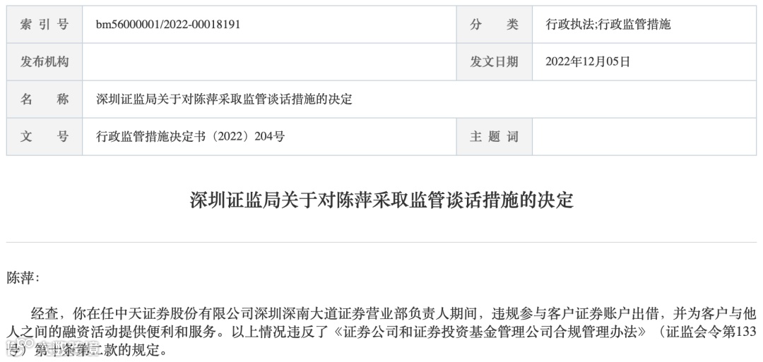无独有偶,深圳证监局同时在另一份罚单中提到了一个相似案例——证券从业者陈萍在任中天证券深圳深南大道营业部负责人期间,违规参与客户证券账户出借,并为客户与他人之间的融资活动提供便利和服务,被深圳证监局决定采取监管谈话的行政监管措施。