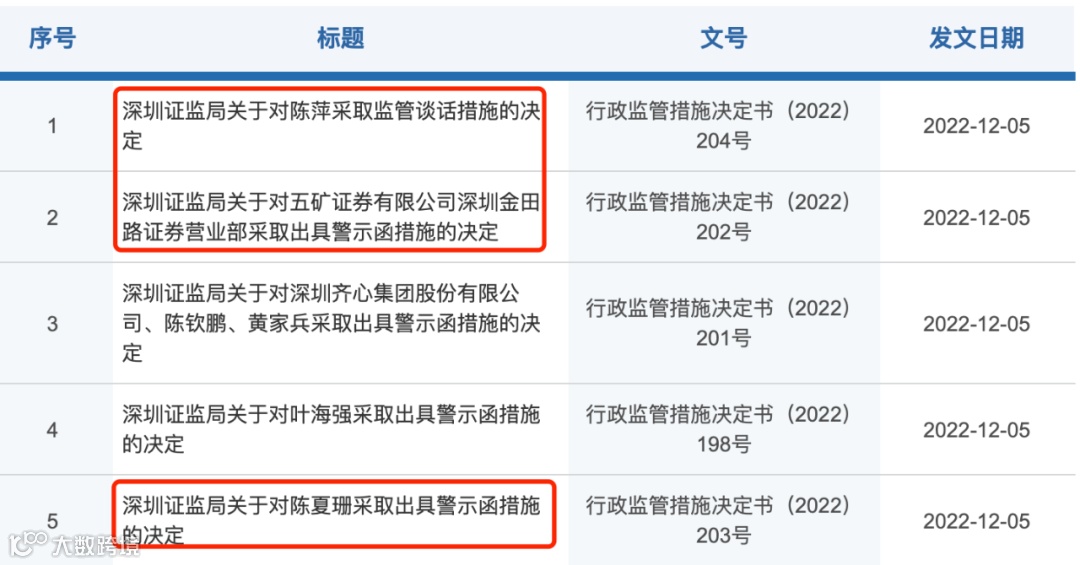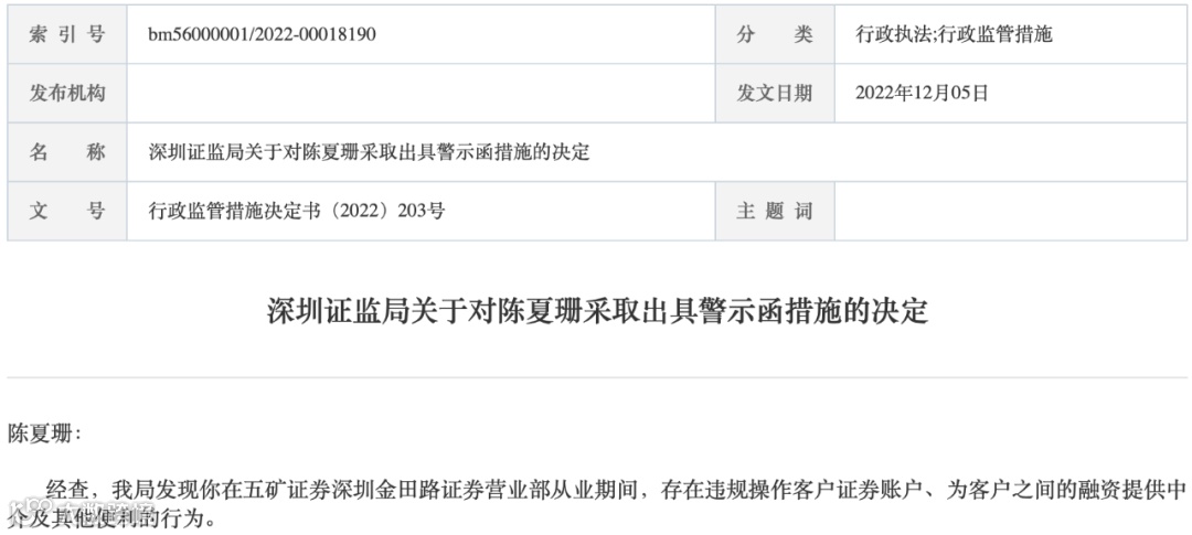 而涉事的证券从业者陈夏珊,因在五矿证券深圳金田路营业部从业期间,存在违规操作客户证券账户、为客户之间的融资提供中介及其他便利的行为,违反了《证券经纪人管理暂行规定》第十二条第一项、第六项的规定,亦被采取出具警示函的行政监管措施。
