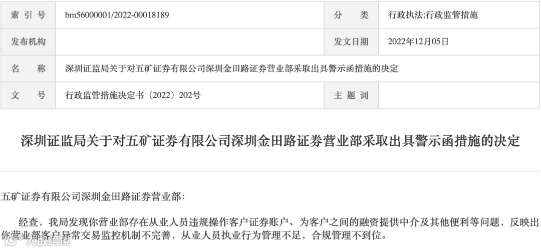 据了解,深圳证监局发现五矿证券深圳金田路营业部存在从业人员违规操作客户证券账户、为客户之间的融资提供中介及其他便利等问题,反映出该营业部客户异常交易监控机制不完善,从业人员执业行为管理不足,合规管理不到位。