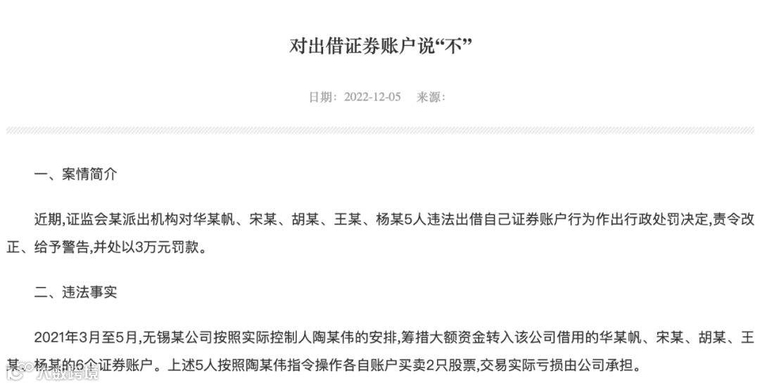 而证监会也在12月5日发布风险警示称,近期证监会某派出机构对华某帆、宋某、胡某、王某、杨某5人违法出借自己证券账户行为作出行政处罚决定,责令改正、给予警告,并处以3万元罚款。