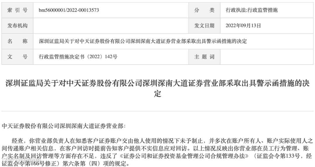 事实上,深圳证监局早在今年9月就已经就上述情况给中天证券深圳深南大道营业部及陈萍双双开出过警示函。彼时深圳证监局表示,该营业部负责人在知悉客户证券账户交由他人使用的情况下未予制止,并多次在账户所有人、账户实际使用人之间传递账户相关信息,在客户回访时提前告知客户提供不实信息应对回访。