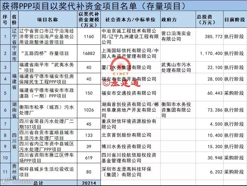 财政部日前通知内公布了获得PPP项目以奖代补资金项目名单,394个项目获得大奖,其中有383个中央财政示范项目中的新建项目获得以奖代补资金总金额为21.07亿;11个地方融资平台公司存量项目获得PPP项目以奖代补资金,总金额为2.02亿。奖金共计23亿。
