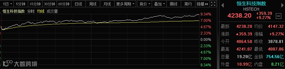 周一,A股和港股大涨,港股恒生科技指数收盘狂飙9.27%。