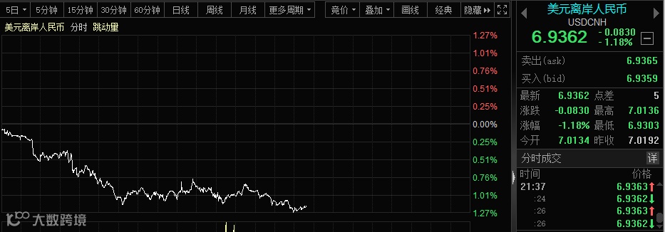 周一晚间,离岸人民币继续大涨,最大涨幅一度接近900点。