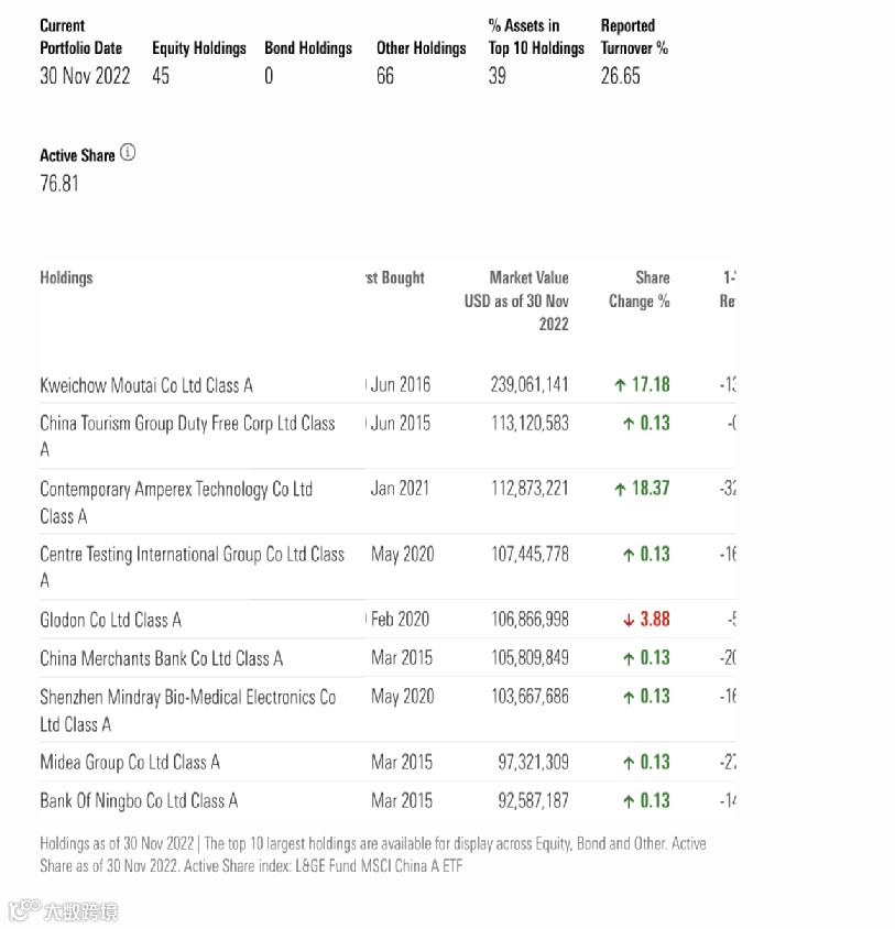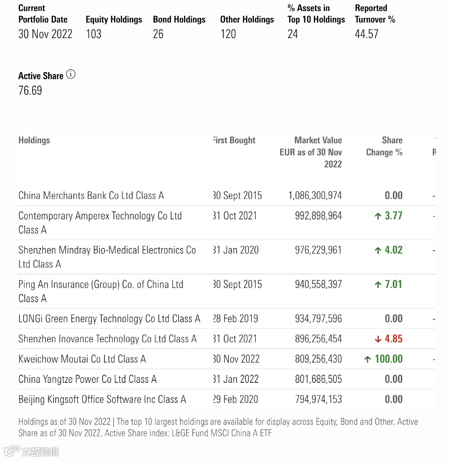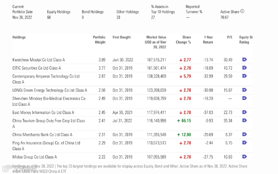 欧洲资管巨头安联投资旗下的安联神州A股基金最新规模50亿美元,是海外规模最大的A股基金之一。截至11月底,基金的重仓股包括:贵州茅台、中信证券、宁德时代、隆基绿能、迈瑞医疗、东方财富、中国中免、招商银行、中国平安、美的集团。11月,基金加仓中国中免66.15%,加仓招商银行12.90%。