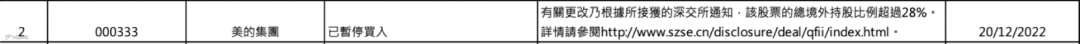 值得注意的是,约两周前,2022年12月20日,美的集团被“买爆”。来自港交所的信息显示,12月20日,港交所暂停深股通美的集团买盘交易,原因为:境外持股比例超过28%。