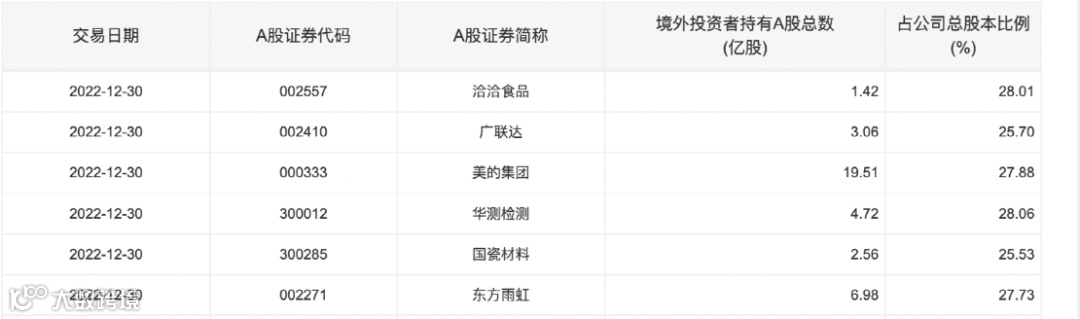 部分个股的外资持股比例提升。来自深交所的数据显示,截至2022年最后一个交易日,2022年12月30日,洽洽食品、广联达、美的集团、华测检测、国瓷材料、东方雨虹等6只股票外资持股比例超过24%。其中,洽洽食品,华测检测的外资持股比例触及28%禁买线。洽洽食品是首次触达禁买线,而华测检测此前多次触达了禁买线。