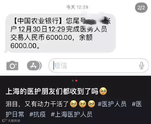 一位已经收到津贴的医护工作者说,“我是30号收到的”,同时他还收到了一条短信,上面写着“现正处疫情防控关键时期,市委市政府为表达对一线医务人员由衷敬意和深深谢意,特此下拨阶段性一次性津贴6000元”。