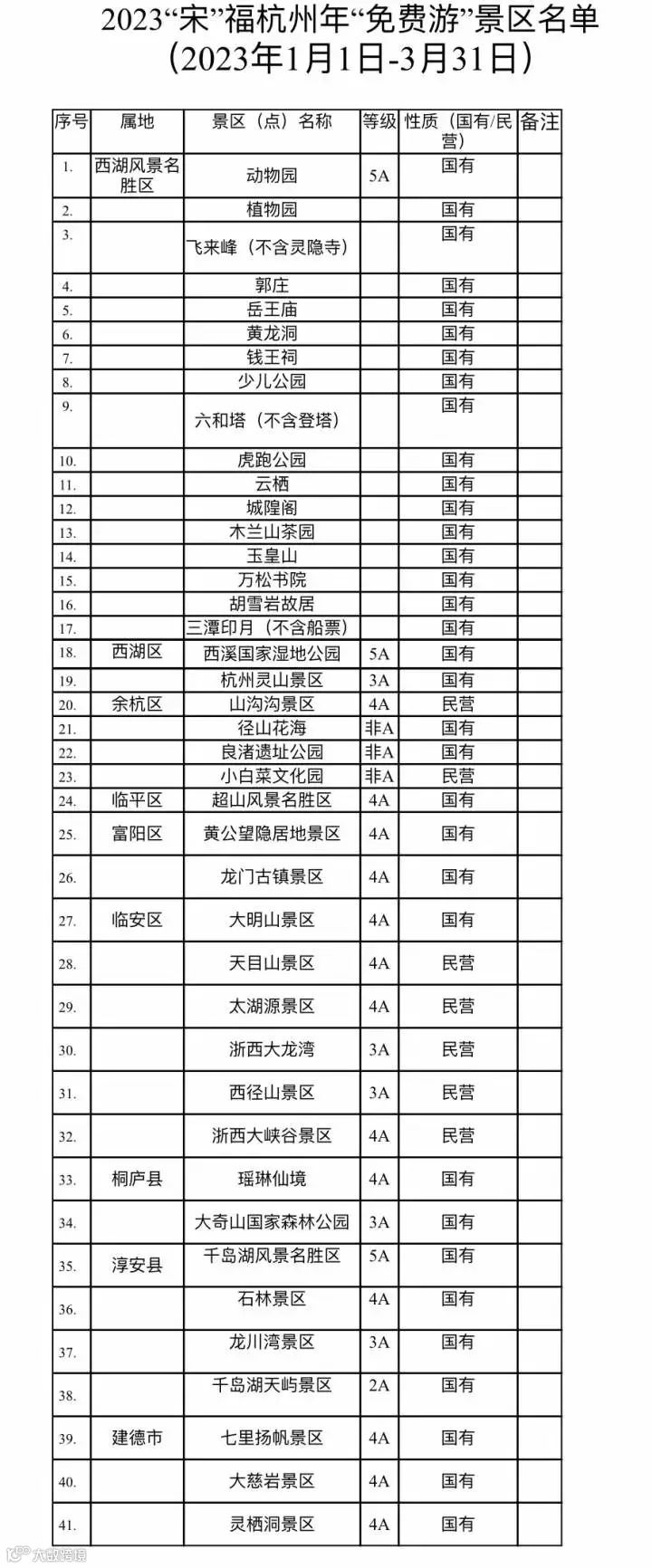 据钱江晚报,2023年元旦起,杭州旅游放大招:国有和部分非国有A级景区实行首道门票免费游,包括你所熟知的西湖景区、西溪湿地、良渚遗址公园、千岛湖、大明山、天目山、黄公望隐居地、瑶琳仙境、七里扬帆等共有41个景区景点,持续时间一直到3月底。