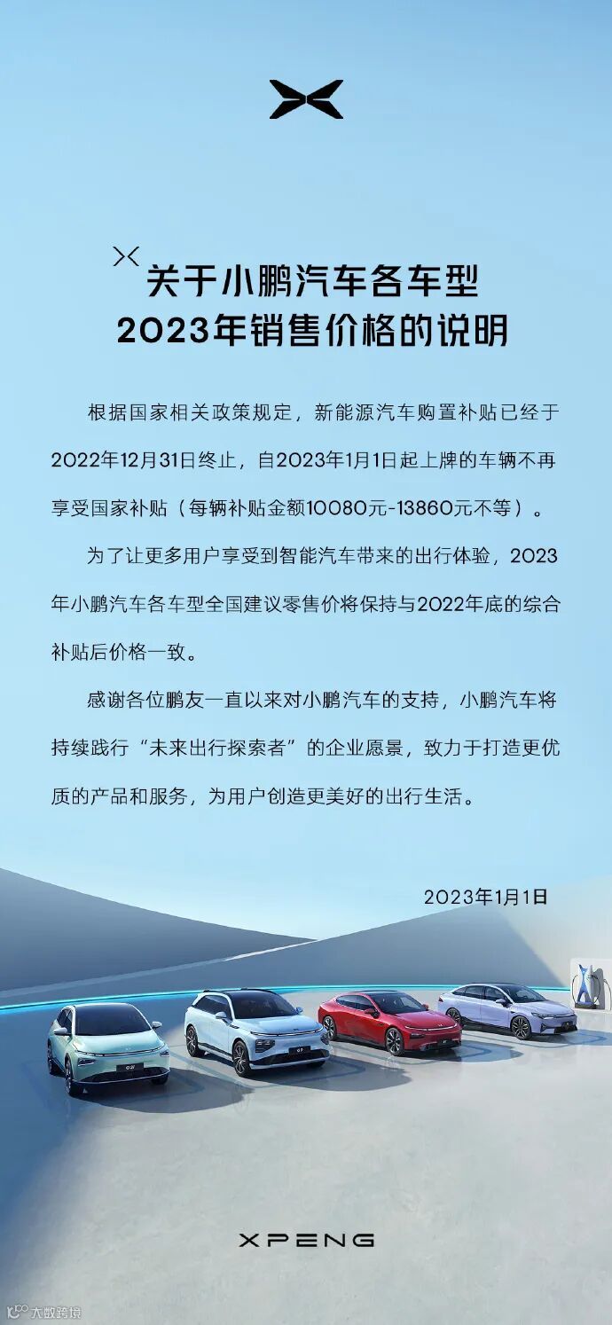 小鹏汽车2023年1月1日同样也推出了保价促销政策,其官微发布关于小鹏汽车各车型 2023 年销售价格的说明。小鹏汽车方面表示,新能源汽车购置补贴已经于 2022 年 12 月 31 日终止,自 2023 年 1 月 1 日起上牌的车辆不再享受国家补贴 (每辆补贴金额 10080 元-13860 元不等)。为了让更多用户享受到智能汽车带来的出行体验,2023 年小鹏汽车各车型全国建议零售价将保持与 2022 年底的综合补贴后价格一致。