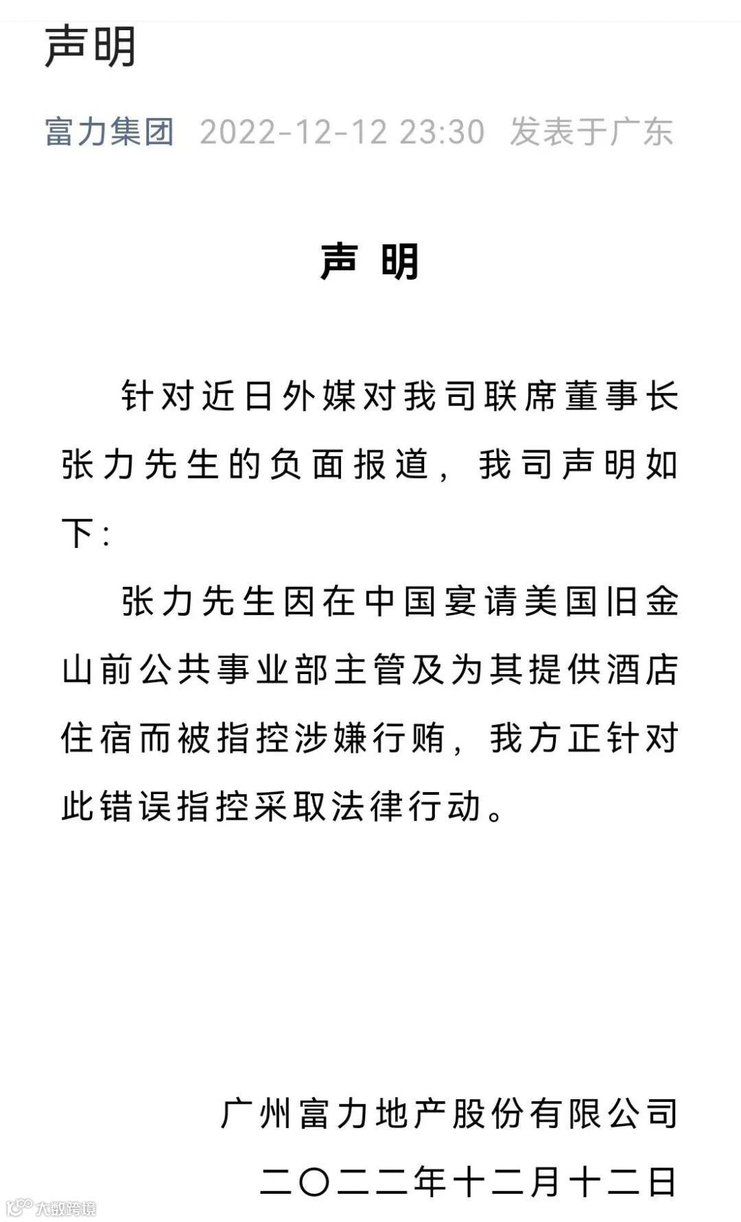 广州富力地产股份有限公司12月12日晚间发布声明指出,“针对近日外媒对我司联席董事长张力先生的负面报道,我司声明如下:张力先生因在中国宴请美国旧金山前公共事业部主管及为其提供酒店住宿而被指控涉嫌行贿,我方正针对此错误指控采取法律行动。”