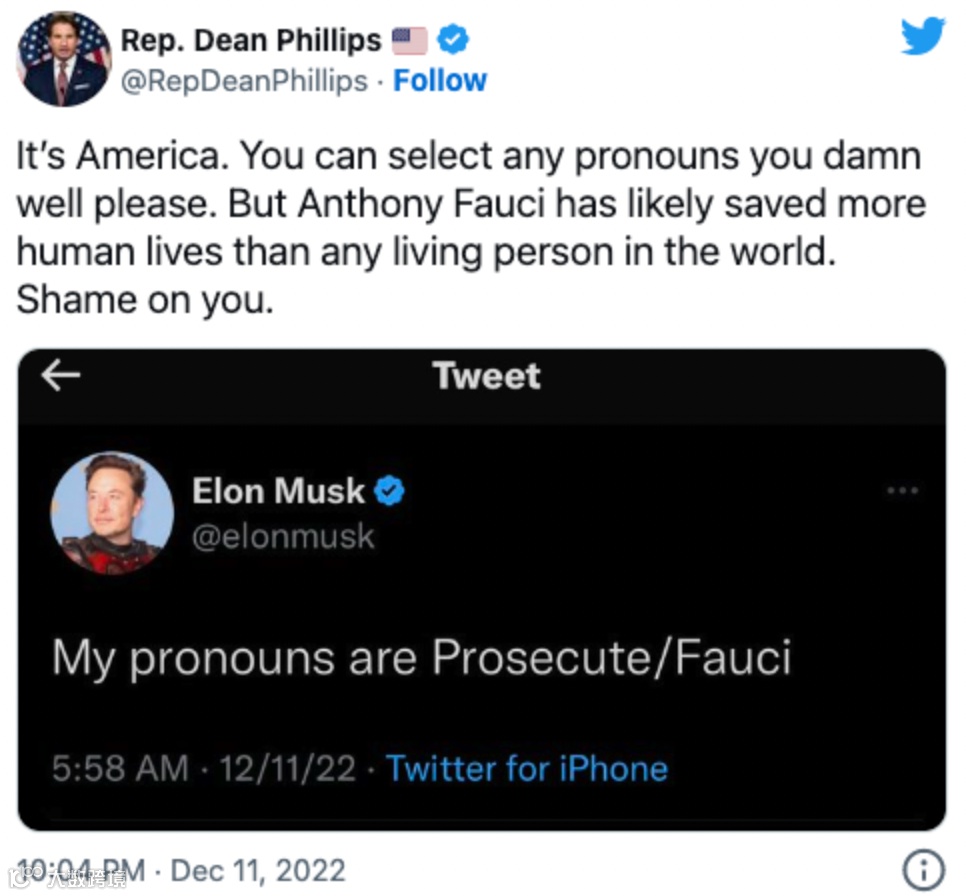另外,美国民主党众议员Dean Phillips在推特上回复称,马斯克可以选择任何词语作为代名词,但福奇拯救的生命可能比任何人都多,马斯克的这一言论太无耻了。