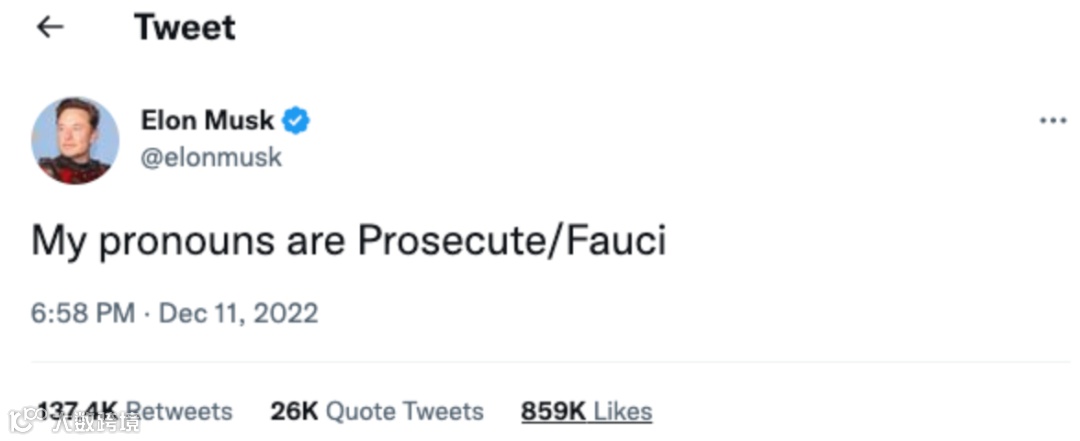 他在推特上发言称:“我的代词是,起诉/福奇”。对此,有媒体评论称,马斯克可能在呼吁共和党调查福奇在担任美国前总统特朗普的首席医疗顾问期间对新冠疫情的处理措施。