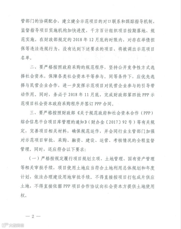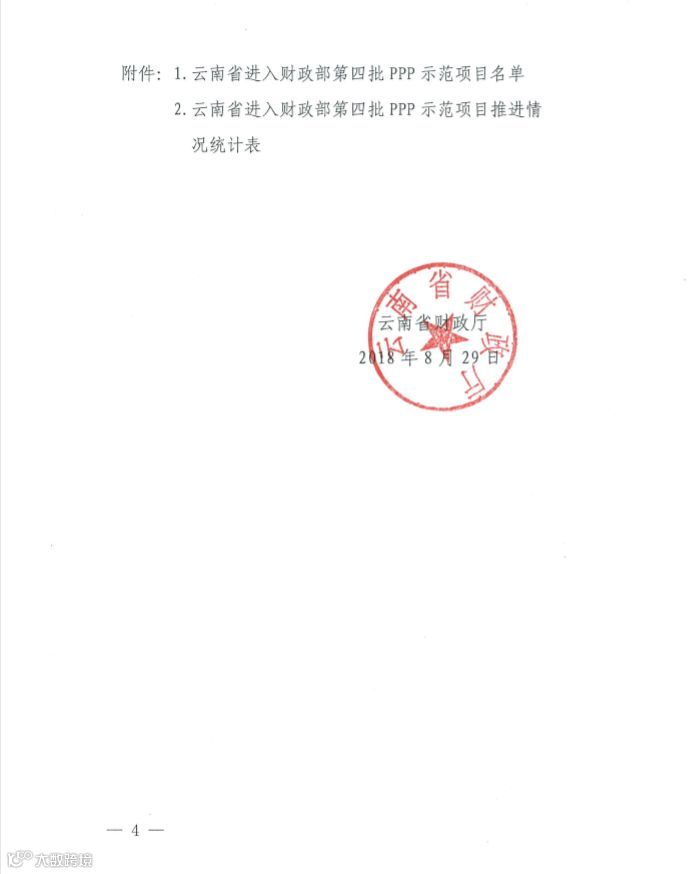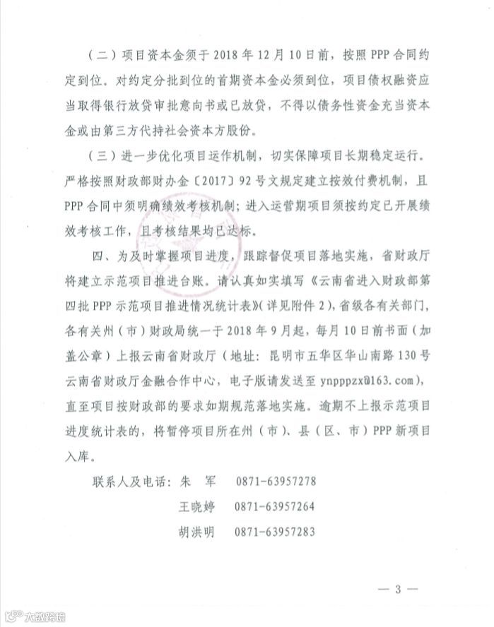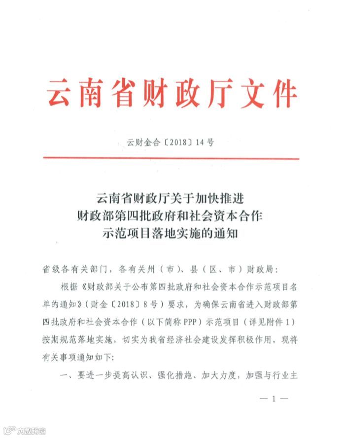 日前,云南省财政厅发出《关于加快推进第四批财政部政府和社会资本合作示范项目落地实施的通知》(云财金合【2018】14号),其中要求: