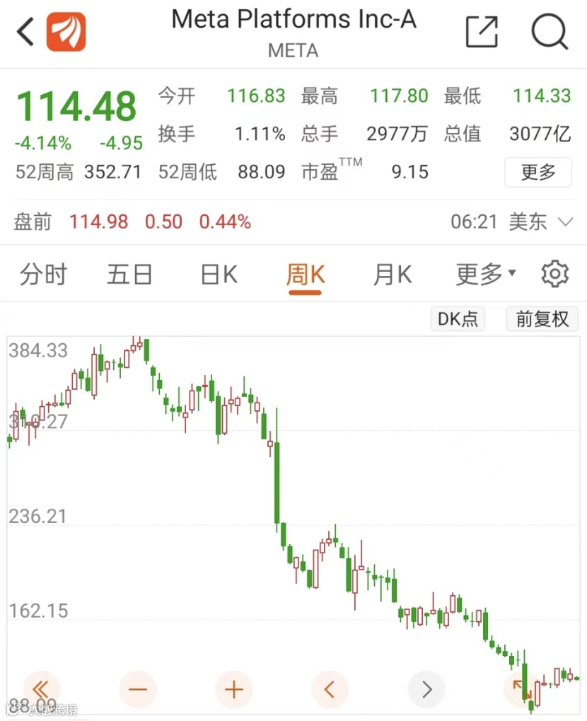 受此影响,Meta股价再度遭遇重挫,当日美盘收盘,Meta跌幅超4%,使得2022年年跌幅扩大至66%,总市值降至3035亿美元,相较于年初,累计蒸发高达5619亿美元(约合人民币39470亿元)。