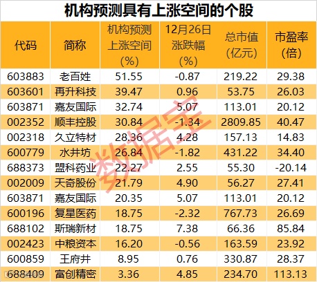 获机构买入型评级个股中,共有14条评级记录中对相关个股给出了未来目标价。以公布的预测目标价与最新收盘价进行对比显示,共有8股上涨空间超20%,老百姓上涨空间最高,12月26日海通证券预计公司目标价为56.8元,上涨空间达51.55%,上涨空间较高的个股还有再升科技、嘉友国际等,上涨空间分别为39.47%、32.74%。