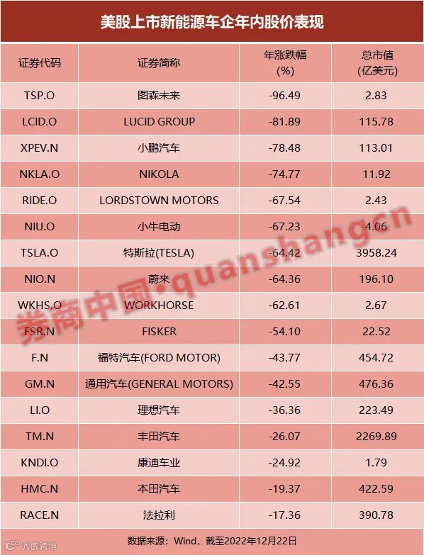 值得注意的是,美股上市的多家新能源车企股价在2022年都遭遇大幅下跌。