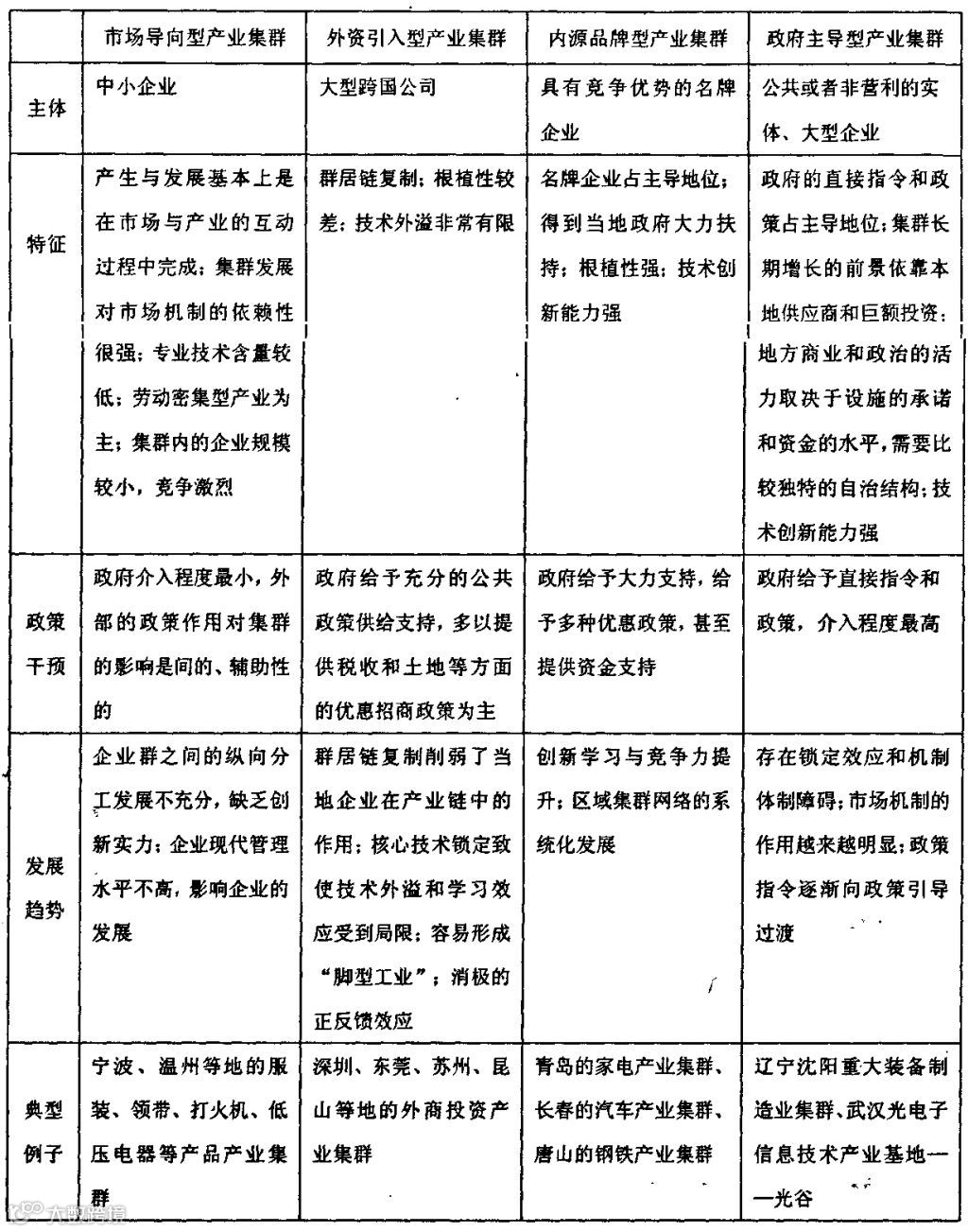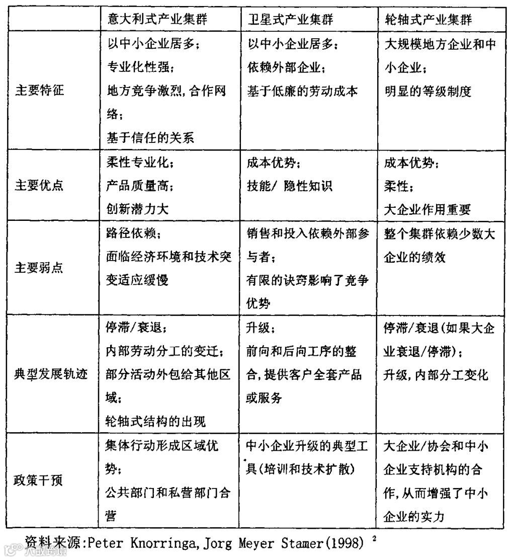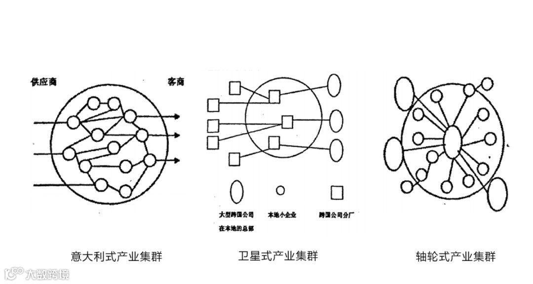 意大利式产业集群以中小企业居多,专业化强,地方竞争激烈,基于的信任关系;卫星式产业集群也以中小企业居多, 但依赖外部企业,基于低廉的劳动成本;轴轮式产业集群包含大规模的地方企业和中小企业,有明显的等级制度。