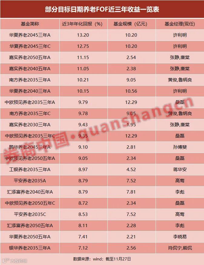 根据Wind数据,截至11月27日全市场养老FOF基金规模约为2000亿元。从近三年维度看,有业绩数据的37只目标风险FOF有36只实现正收益,平均年化收益率约为5%,最高收益率接近9%;有业绩数据的41只目标日期FOF均实现正收益,平均年化收益率约为7%,最高收益率超过13%,最低也在1.5%之上。