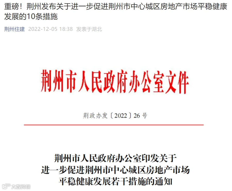 12月5日,据“荆州住建”公众号,荆州发布了关于进一步促进荆州市中心城区房地产市场平稳健康发展的10条措施。