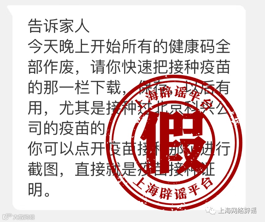 据“上海网络辟谣”微信公众号消息,12月13日,上海辟谣平台收到多条留言,询问网传“健康码要作废,要截屏疫苗接种记录,否则会找不到接种记录”的说法是不是真的。上海市大数据中心答复称,相关说法不实。