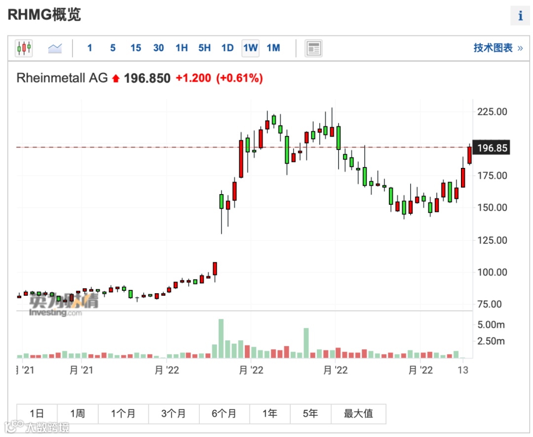 这也直接刺激了欧美军火商的股价大涨,以德国的莱茵金属公司(Rheinmetall AG)为例,自2022年年初以来,莱茵金属股价累计涨幅高达137%。
