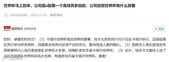 星辉娱乐更是表示,公司旗下足球俱乐部将有球员参加世界杯。