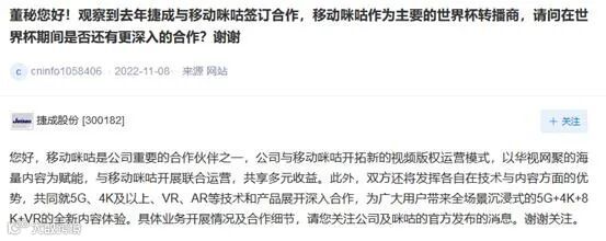 除了锋尚文化,捷成股份也表示,公司与咪咕将发挥各自在技术与内容方面的优势,共同就5G、4K及以上、VR、AR等技术和产品展开深入合作,为广大用户带来全场景沉浸式的5G+4K+8K+VR的全新内容体验。