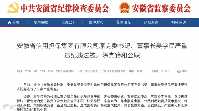 安徽纪检监察网11月17日信息显示:日前,经安徽省委批准,安徽省纪委监委对省信用担保集团原党委书记、董事长吴学民严重违纪违法问题进行了立案审查调查。