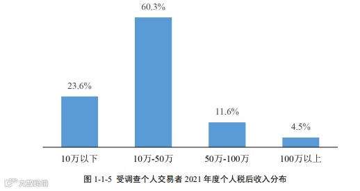 从收入水平来看,个人交易者2021年度个人税后收入在10万-50万元之间的最多,占比 60.3%,10万元以下的占比23.6%,50万元-100万元之间占比11.6%,100万元以上收入者占比4.5%。