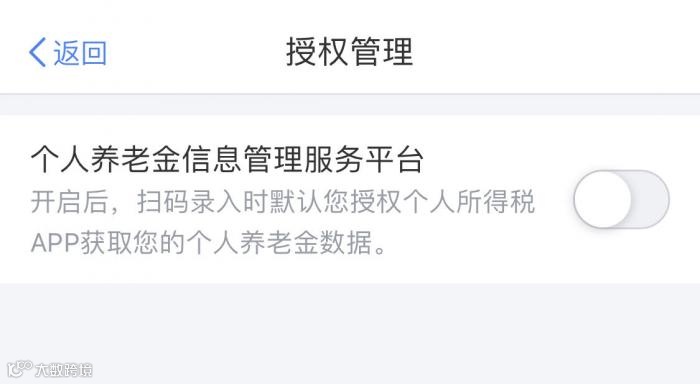 “个人养老金扣除信息管理”页面右上方的“授权管理”中提示,选择开启该功能后,扫码录入时默认参加人授权个人所得税APP获取参加人的个人养老金数据。