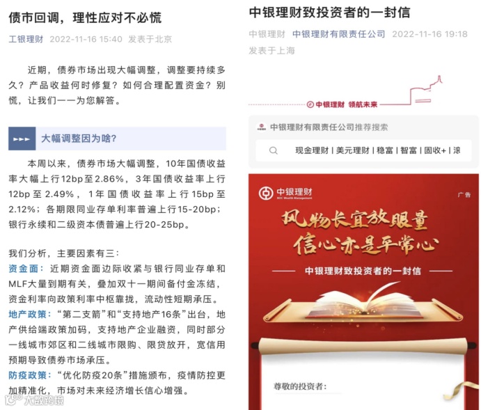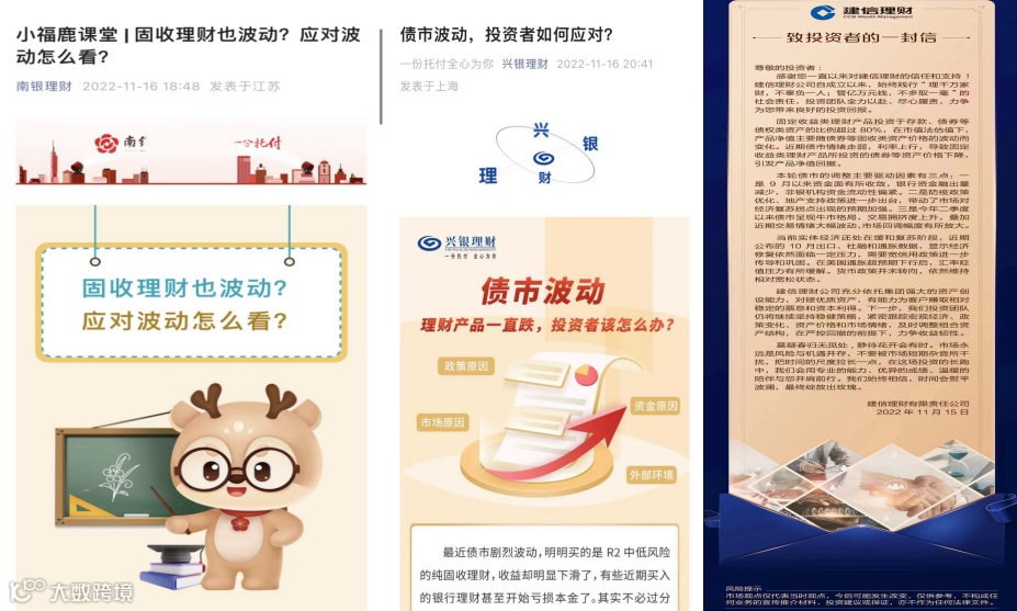 此外,包括中银理财、工银理财、南银理财、兴银理财、建信理财在内的管理人,微众银行在内的理财代销机构也出来喊话,向投资人传递固收理财仍是投资好选择的理念(因仍具有低波动率),并希望投资人以长期视角持有产品。