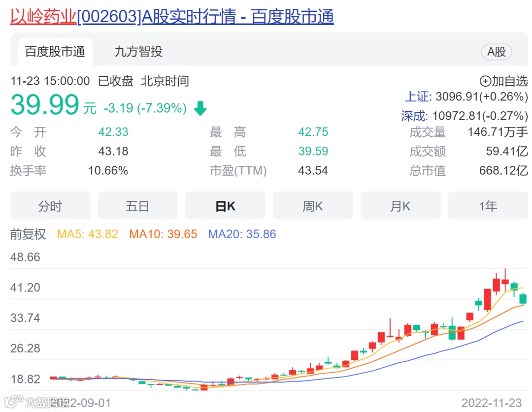 行情数据显示,9月底至今不到两个月的时间,以岭药业股价从18.8元左右一路上涨。尤其是进入11月以来,伴随着成交量的放大,以岭药业因股价持续大涨两次发布异动公告,并于11月21日触及48.66元/股的历史新高。不过,近两个交易日股价有所回调,最新报收39.99元。