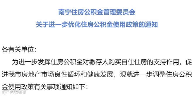11月1日,南宁住房公积金管理委员会发布《关于进一步优化住房公积金使用政策的通知》。本通知自2022年11月1日起施行,有效期五年。
