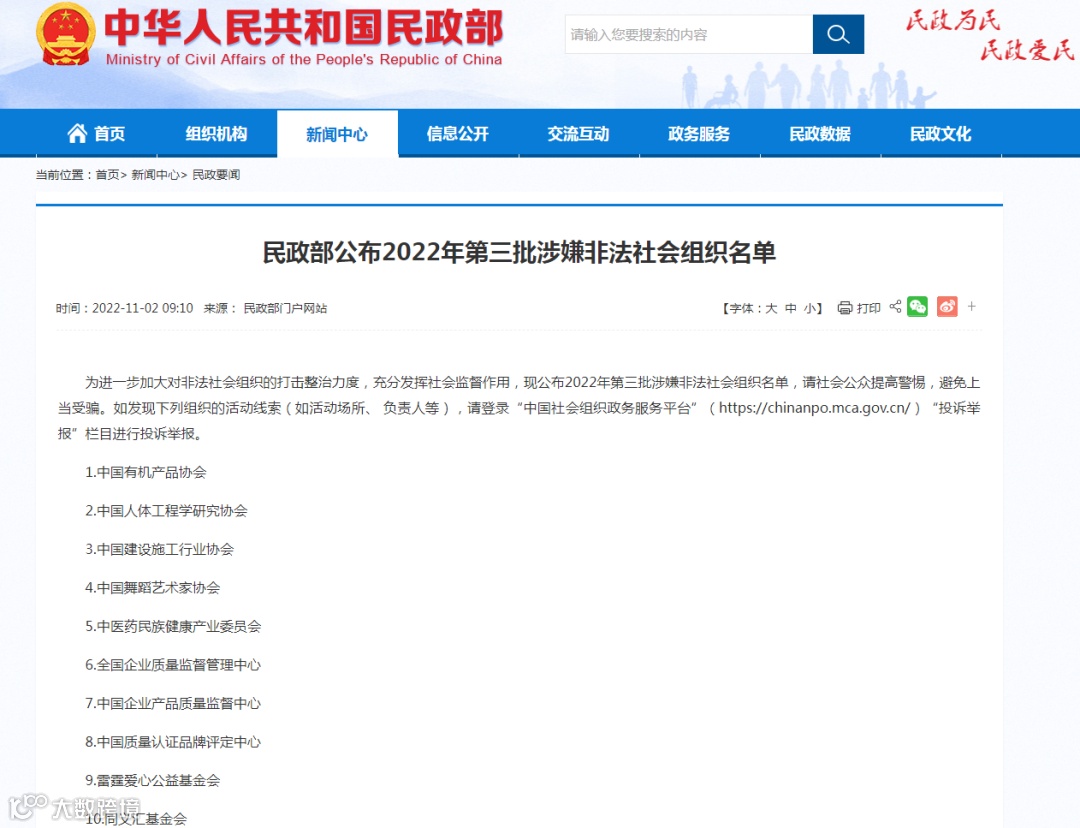 11月2日,民政部公布2022年第三批涉嫌非法社会组织名单,包括中国舞蹈艺术家协会等10家。具体如下: