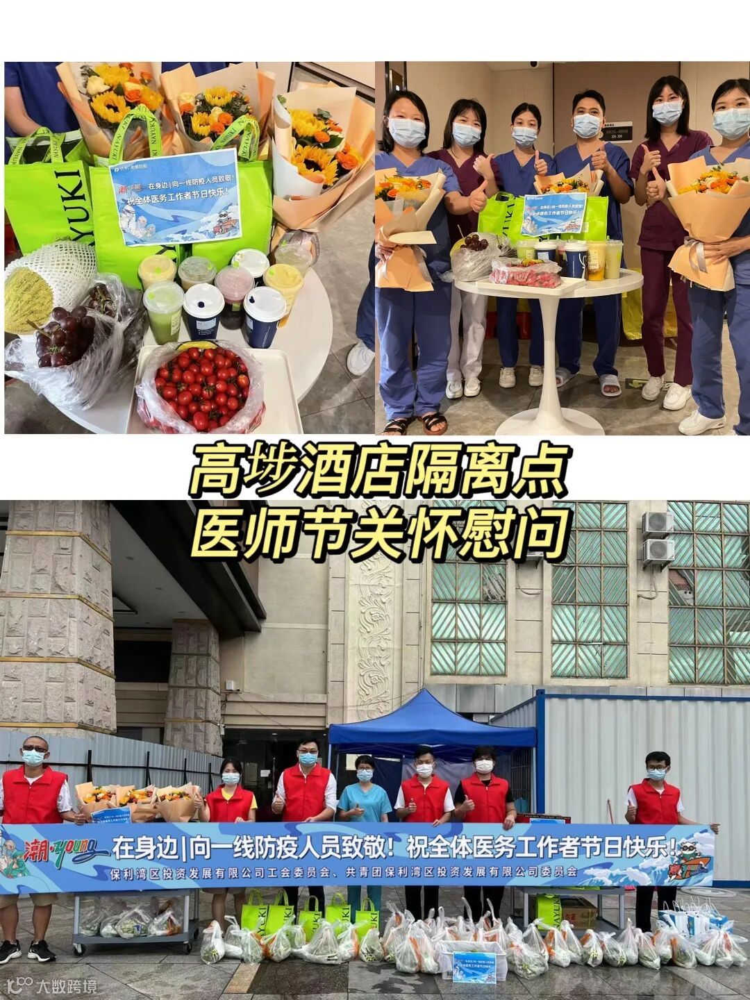 2022年8月19日下午,在第五个“中国医师节”来临之际,在公司团委及工会牵头组织下,公司潮·young青年志愿服务队联合相关部门前往高埗欧斯卡酒店和生态园公租房进行医师节关怀。在疫情保障服务队通力协作下,顺利完成对医护人员的关怀及慰问工作。