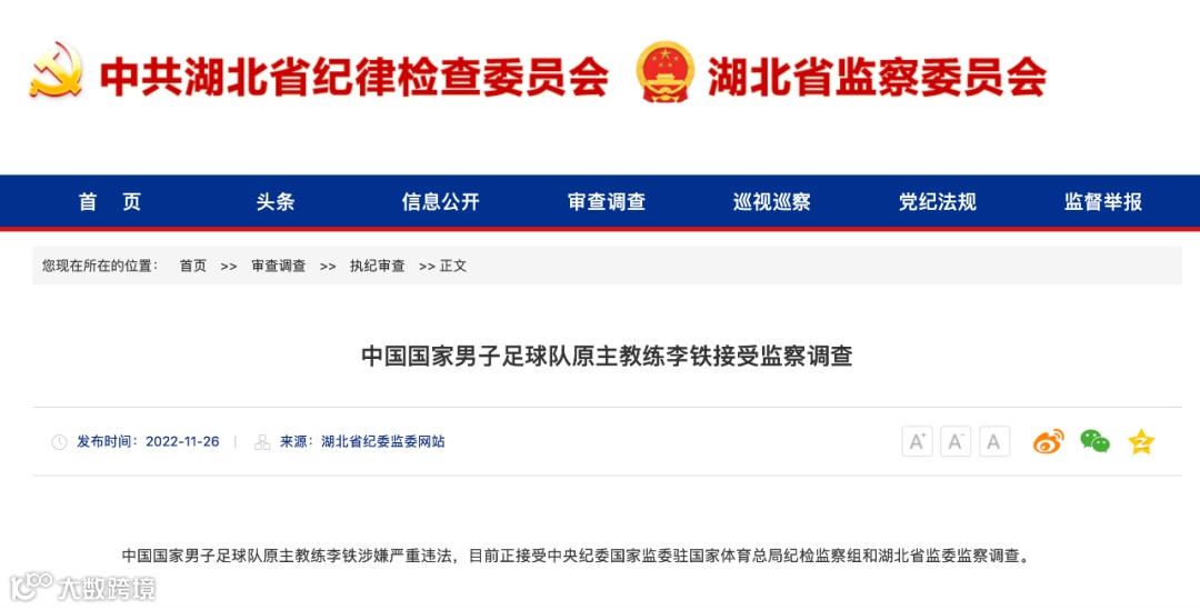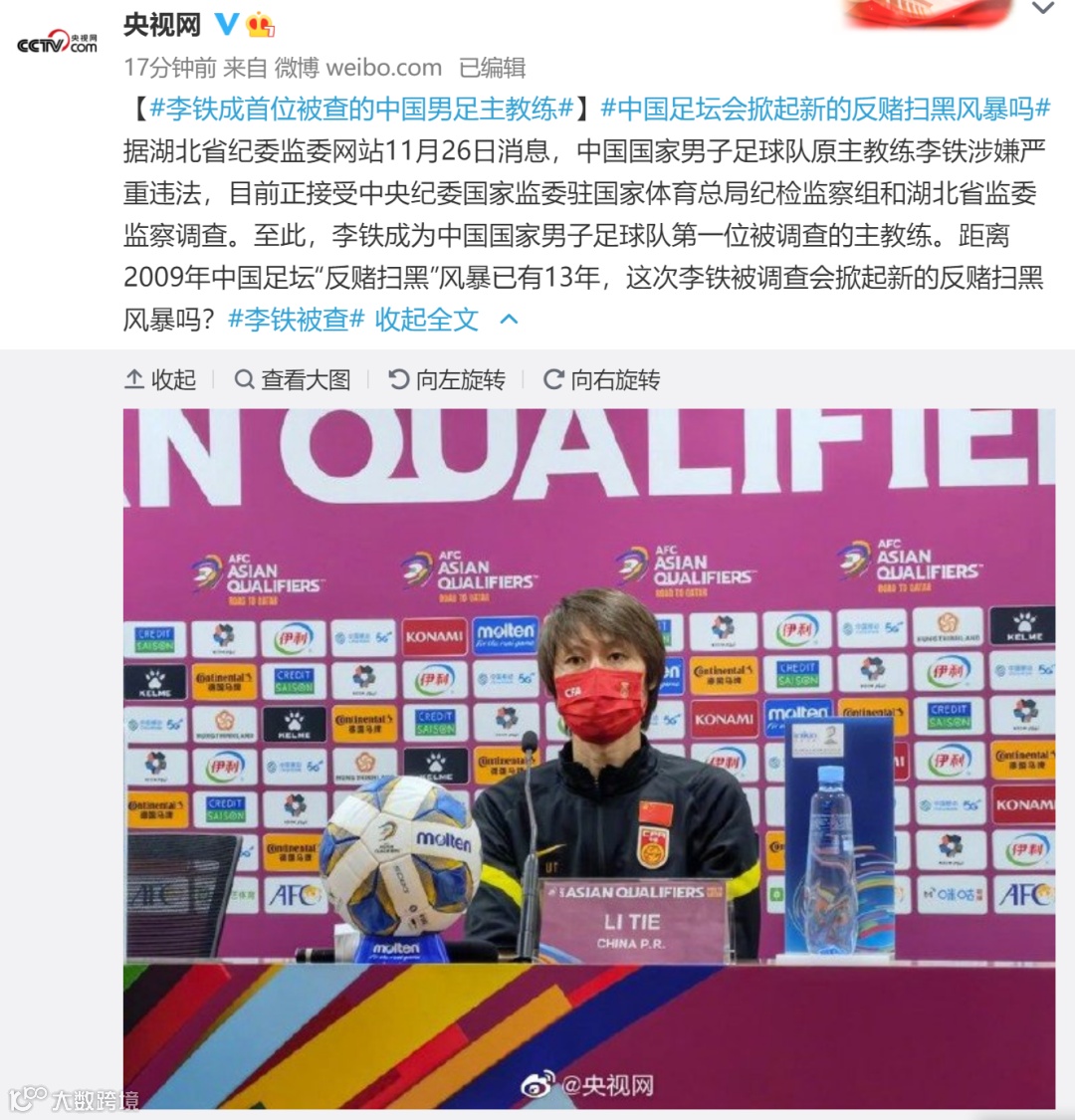 据湖北省纪委监委网站11月26日消息,中国国家男子足球队原主教练李铁涉嫌严重违法,目前正接受中央纪委国家监委驻国家体育总局纪检监察组和湖北省监委监察调查。